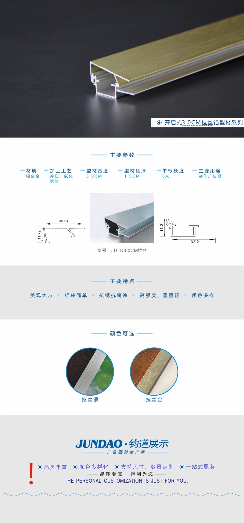 3.0CM拉丝金广告型材/广告框型材加工