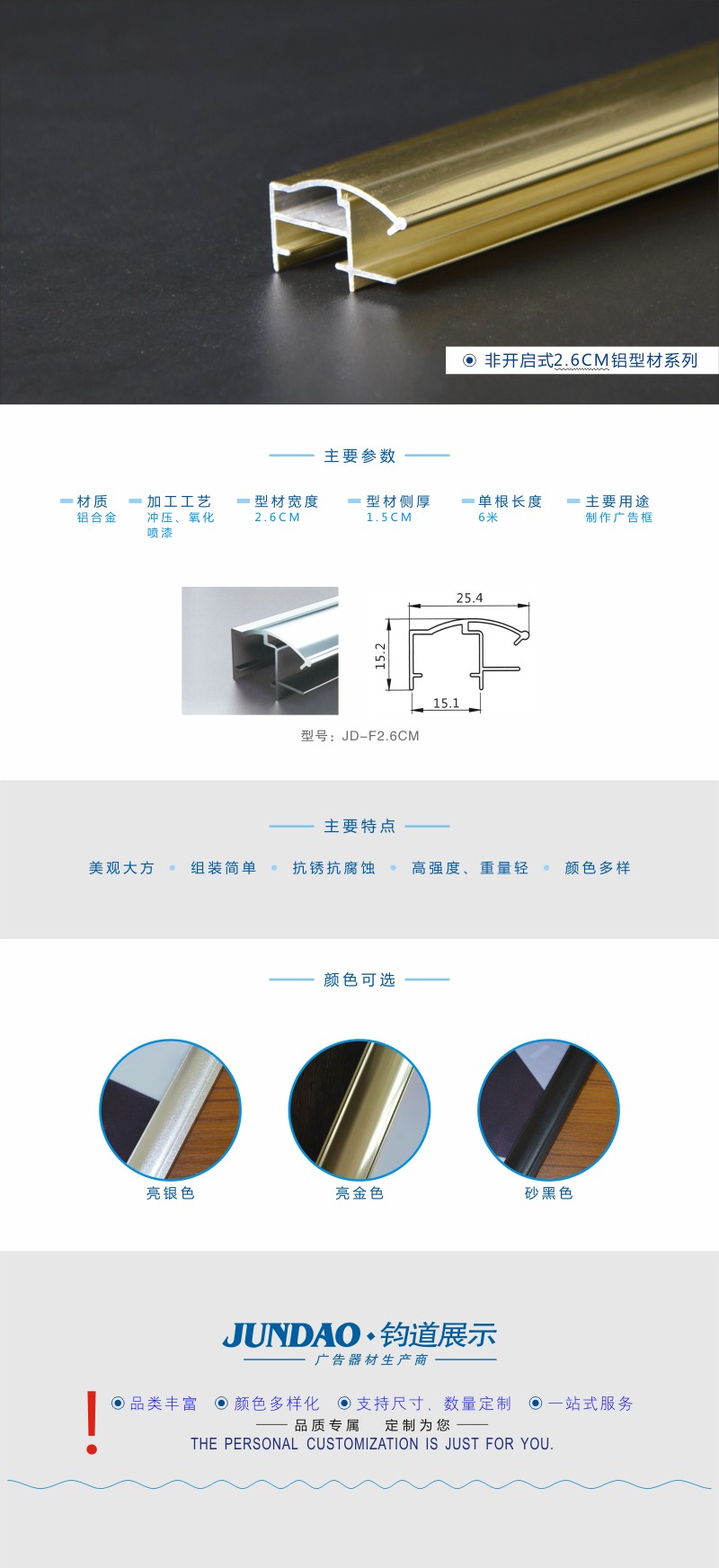 2.6CM非开启亮金色广告铝型材/相框型材加工