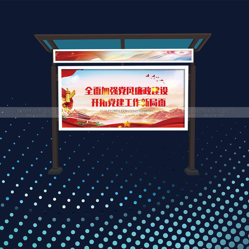 河南钧道实业有限公司主营:铝合金户外带雨棚宣传栏、垃圾分类亭、挂墙报栏、移动展架、广告铝框、可折叠海报架、灯杆道旗、带造型灯杆灯箱、标识牌、花草牌等成品。
