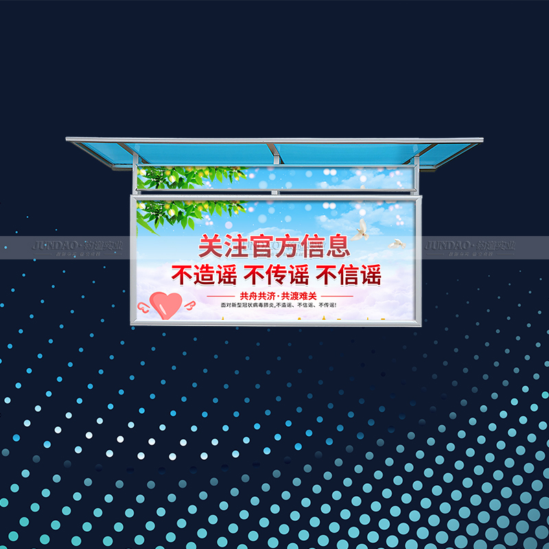 河南钧道实业有限公司主营:铝合金户外带雨棚宣传栏、垃圾分类亭、挂墙报栏、移动展架、广告铝框、可折叠海报架、灯杆道旗、带造型灯杆灯箱、标识牌、花草牌等成品。