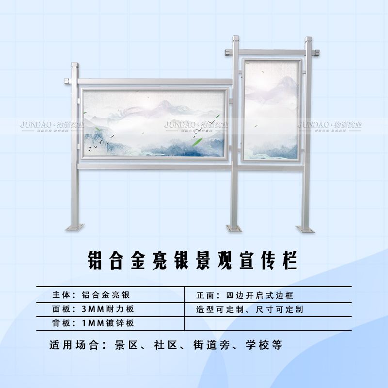 河南钧道实业有限公司主营:铝合金户外带雨棚宣传栏、垃圾分类亭、挂墙报栏、移动展架、广告铝框、可折叠海报架、灯杆道旗、带造型灯杆灯箱、标识牌、花草牌等成品。