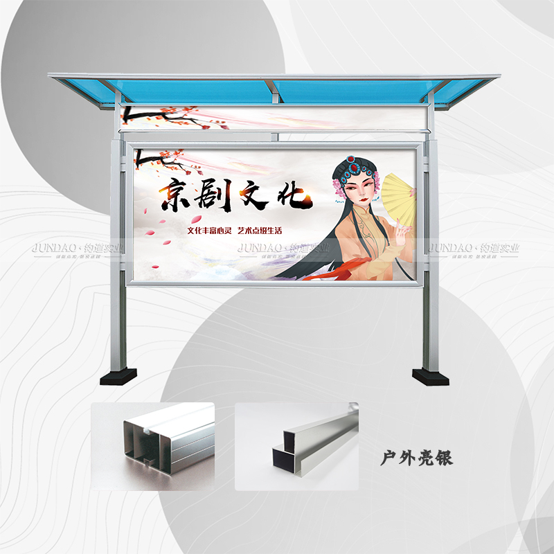 河南钧道实业有限公司主营:铝合金户外带雨棚宣传栏、垃圾分类亭、挂墙报栏、移动展架、广告铝框、可折叠海报架、灯杆道旗、带造型灯杆灯箱、标识牌、花草牌等成品。