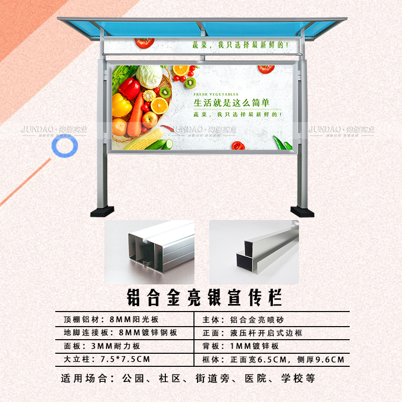 2、宣传栏主料全部采用亮喷砂三酸镀膜处理的高强度铝合金,不生锈抗酸雨性好,耐腐蚀。