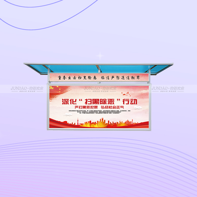 河南钧道实业有限公司主营:铝合金户外带雨棚宣传栏、垃圾分类亭、挂墙报栏、移动展架、广告铝框、可折叠海报架、灯杆道旗、带造型灯杆灯箱、标识牌、花草牌等成品。