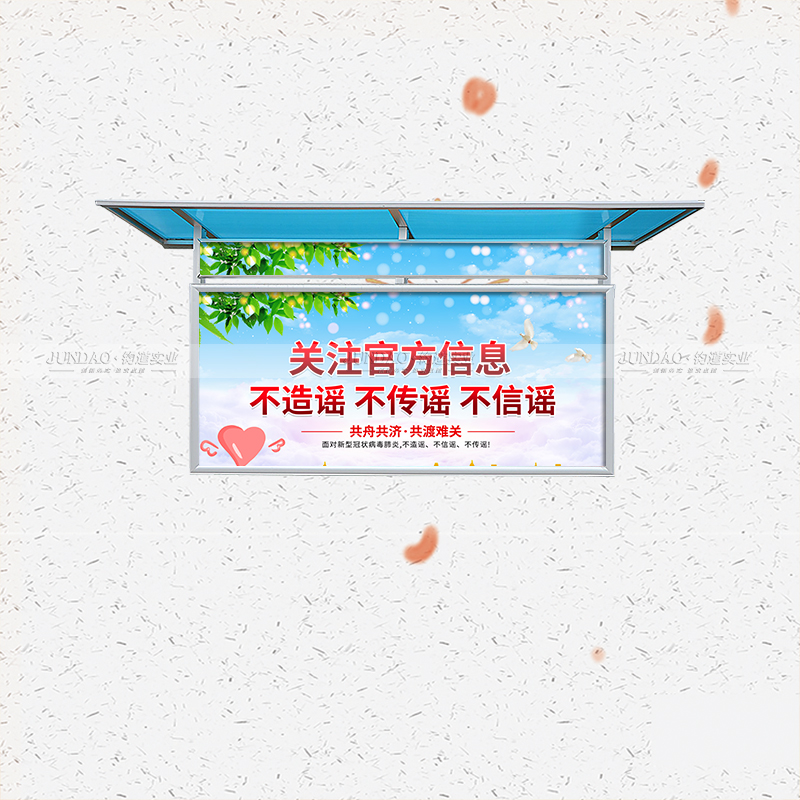 河南钧道实业有限公司主营:铝合金户外带雨棚宣传栏、垃圾分类亭、挂墙报栏、移动展架、广告铝框、可折叠海报架、灯杆道旗、带造型灯杆灯箱、标识牌、花草牌等成品。