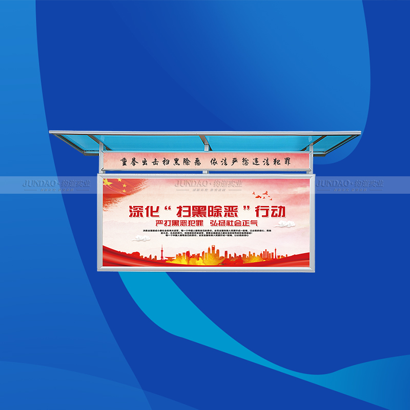 河南钧道实业有限公司主营:铝合金户外带雨棚宣传栏、垃圾分类亭、挂墙报栏、移动展架、广告铝框、可折叠海报架、灯杆道旗、带造型灯杆灯箱、标识牌、花草牌等成品。