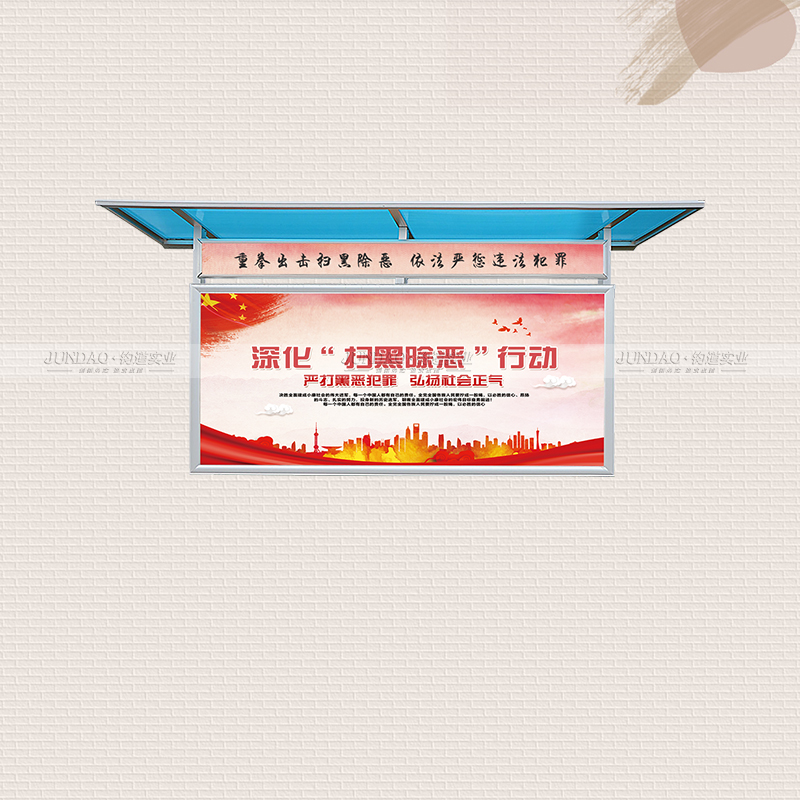 河南钧道实业有限公司主营:铝合金户外带雨棚宣传栏、垃圾分类亭、挂墙报栏、移动展架、广告铝框、可折叠海报架、灯杆道旗、带造型灯杆灯箱、标识牌、花草牌等成品。