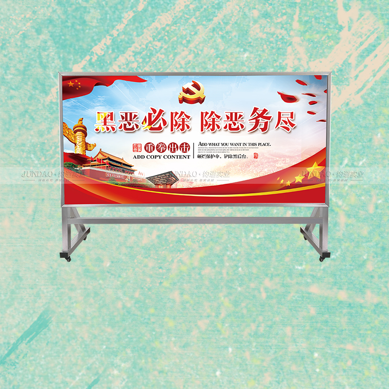 河南钧道实业有限公司主营:铝合金户外带雨棚宣传栏、垃圾分类亭、挂墙报栏、移动展架、广告铝框、可折叠海报架、灯杆道旗、带造型灯杆灯箱、标识牌、花草牌等成品。
