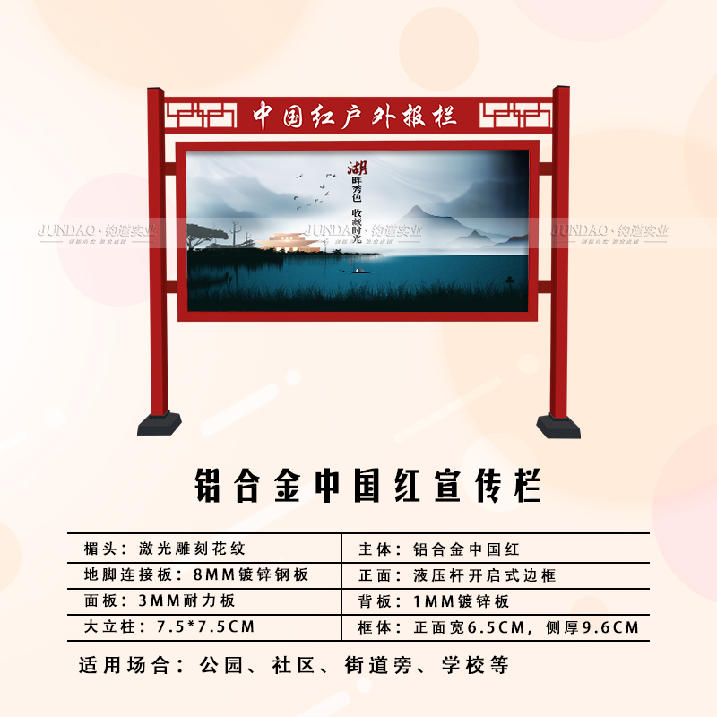 河南钧道实业有限公司主营:铝合金户外带雨棚宣传栏、垃圾分类亭、挂墙报栏、移动展架、广告铝框、可折叠海报架、灯杆道旗、带造型灯杆灯箱、标识牌、花草牌等成品。
