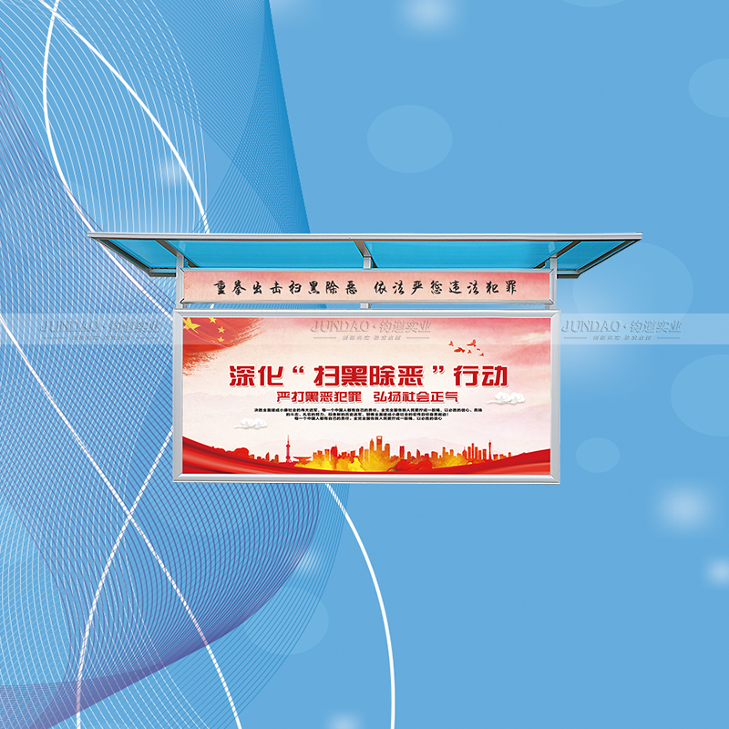 河南钧道实业有限公司主营:铝合金户外带雨棚宣传栏、垃圾分类亭、挂墙报栏、移动展架、广告铝框、可折叠海报架、灯杆道旗、带造型灯杆灯箱、标识牌、花草牌等成品。