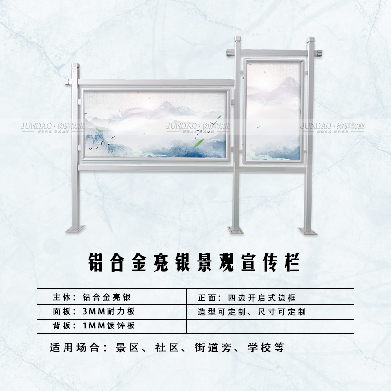 河南钧道实业有限公司主营:铝合金户外带雨棚宣传栏、垃圾分类亭、挂墙报栏、移动展架、广告铝框、可折叠海报架、灯杆道旗、带造型灯杆灯箱、标识牌、花草牌等成品。