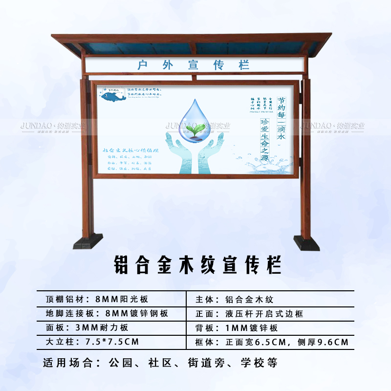 河南钧道实业有限公司主营:铝合金户外带雨棚宣传栏、垃圾分类亭、挂墙报栏、移动展架、广告铝框、可折叠海报架、灯杆道旗、带造型灯杆灯箱、标识牌、花草牌等成品。