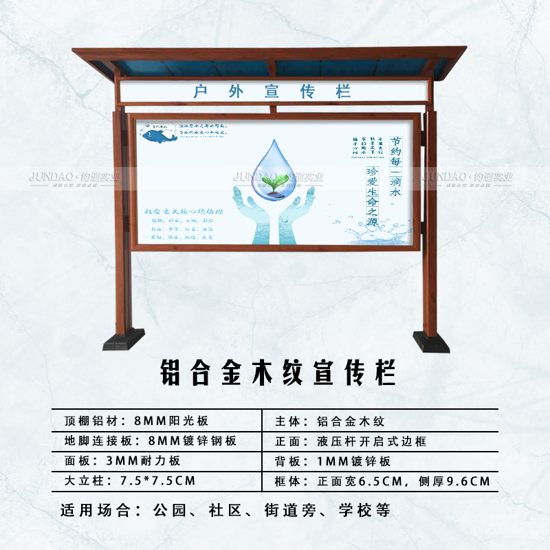 河南钧道实业有限公司主营;铝合金户外带雨棚宣传栏、垃圾分类亭,挂墙报栏、移动展架、开启式非开启式铝框、可折叠海报架、灯杆道旗、带造型灯杆灯箱、超薄灯箱、卡布拉布灯箱等成品。