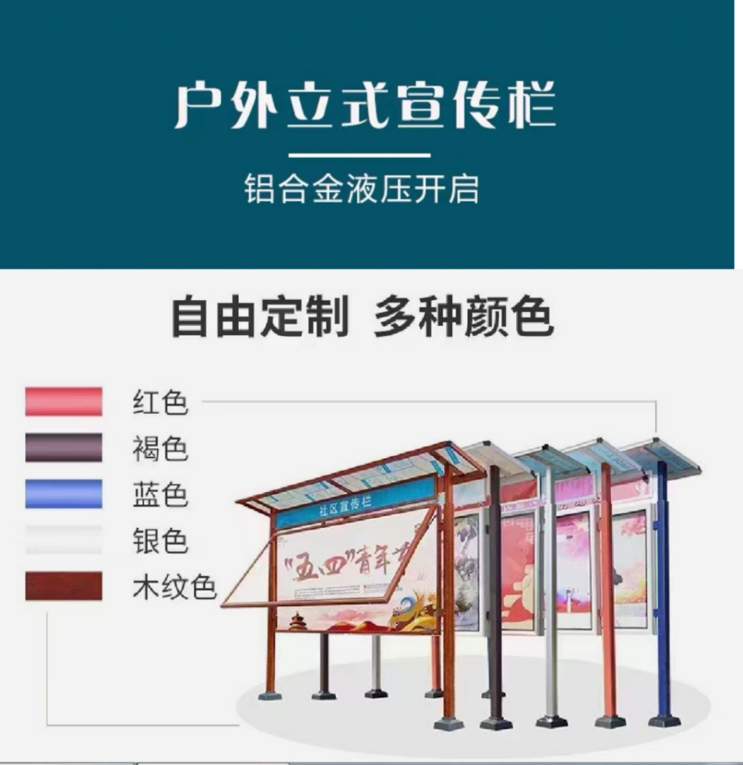 铝合金液压开启宣传栏 多用于社区党群服务中心、街道办事处、政务大厅、党建广场,校园,社区与物业园区,企业厂区、商业综合体、工业园区、医院、部队营房等场所,铝合金液压开启宣传栏也被用于企业文化展示、安全生产公告、招聘信息、活动通知等,兼顾实用性与美观性,成为各类单位标准化展示的重要配置。