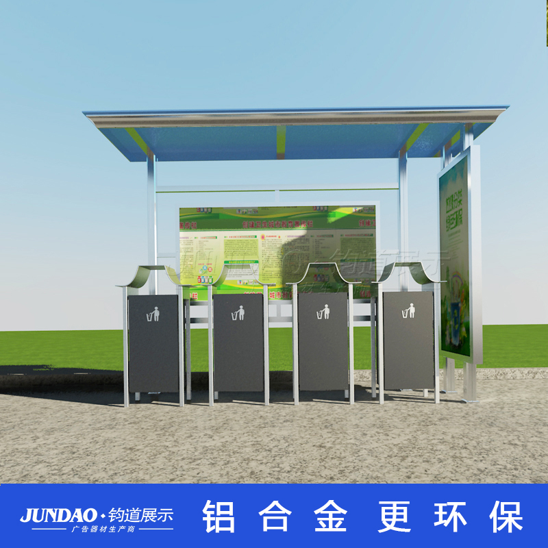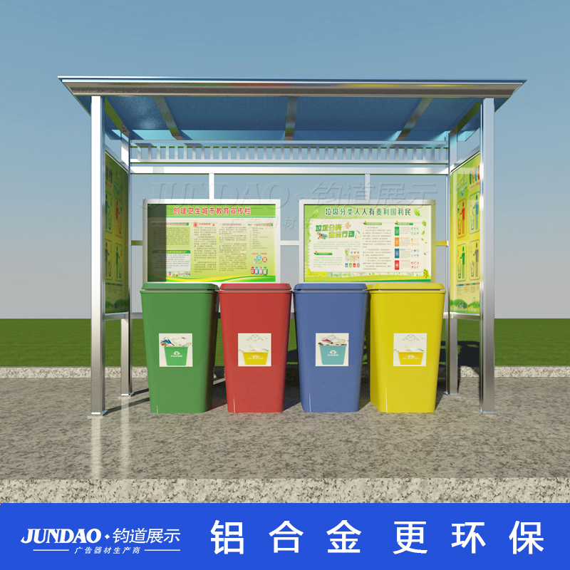 目前,生活垃圾分类收集是城市生活垃圾处置的主流趋势,也是现代城市文明进步的标志之一,有利于提升垃圾清运效率,便于再生资源的回收利用,减少环境污染,缓解环卫工人常规保洁的压力。垃圾分类亭,分为地基基础设施、公益宣传栏、立柱、顶棚等,亭内设置可回收、有害垃圾、厨房垃圾和其他垃圾等垃圾桶,垃圾桶及宣传栏配有垃圾分类的宣传标语,广大群众可以根据垃圾桶的提示标语,将废弃的生活垃圾投放到对应的垃圾桶中。