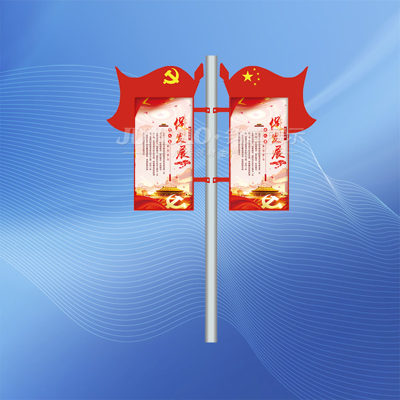 灯杆道旗由灯杆道旗画面、灯杆道旗支架、灯杆道旗卡具3部分组合而成,画面当然是主体,所有的部分都是围绕灯杆道旗画面来进行的。
