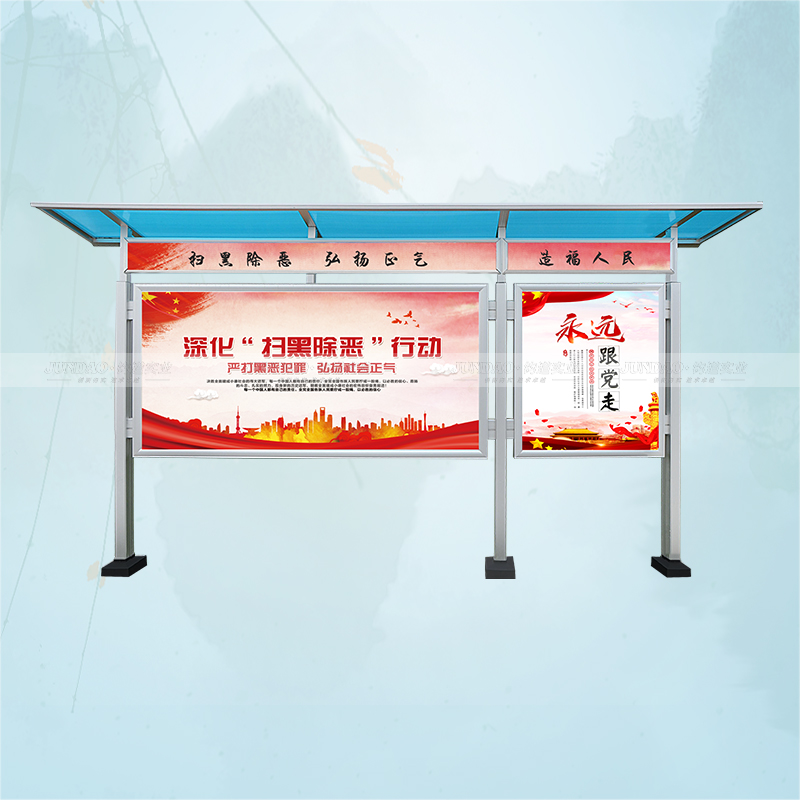 现在是21世纪,宣传栏制造有了突飞猛进的发展,主要有镀锌板、铝合金等材质折弯焊接而成,表面具有超强的抗锈蚀、抗腐蚀能力。郑州钧道广告器材有限公司设计、研发、制作的宣传栏全部采用国标镀锌板和铝合金,厚度都是足1.5mm~2mm。顶棚采用2mm的阳光板,安全性高,显示效果清晰,透光度高。不光材质好,造型也多种多样,有古典的,现代的,时尚的和小清新的,色彩之艳丽,造型之流畅,彻底改变了宣传栏呆板老旧的印象。真正成为了城市美化不可缺少的一道亮丽风景线!