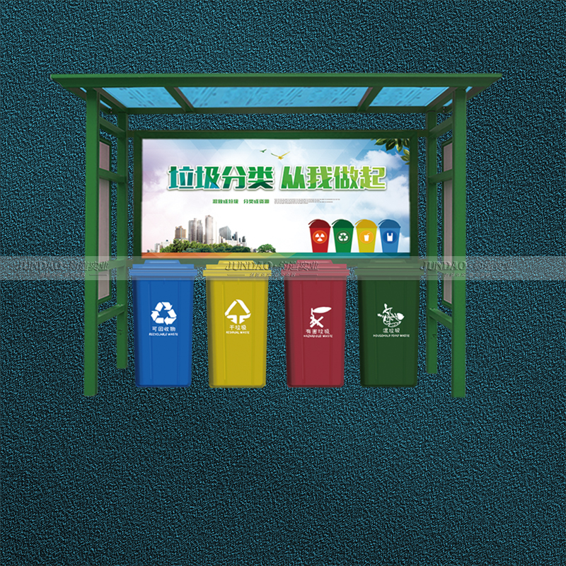 目前,生活垃圾分类收集是城市生活垃圾处置的主流趋势,也是现代城市文明进步的标志之一,有利于提升垃圾清运效率,便于再生资源的回收利用,减少环境污染,缓解环卫工人常规保洁的压力。垃圾分类亭,分为地基基础设施、公益宣传栏、立柱、顶棚等,亭内设置可回收、有害垃圾、厨房垃圾和其他垃圾等垃圾桶,垃圾桶及宣传栏配有垃圾分类的宣传标语,广大群众可以根据垃圾桶的提示标语,将废弃的生活垃圾投放到对应的垃圾桶中。