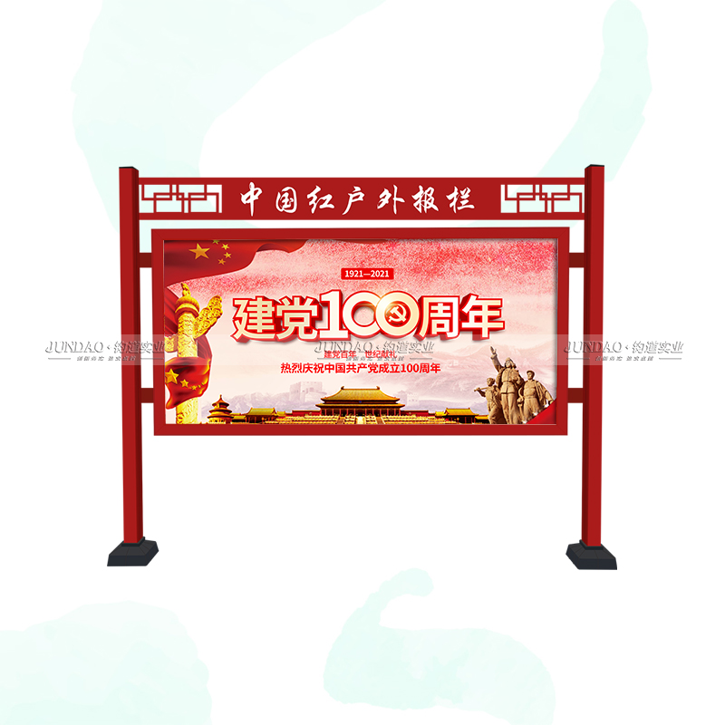 河南钧道实业有限公司主营:铝合金户外带雨棚宣传栏、垃圾分类亭,挂墙报栏、移动展架、广告铝框、可折叠海报架、灯杆道旗、带造型灯杆灯箱、党建标识牌、花草牌等成品。