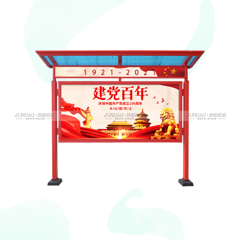 河南钧道实业有限公司主营:铝合金户外带雨棚宣传栏、垃圾分类亭,挂墙报栏、移动展架、广告铝框、可折叠海报架、灯杆道旗、带造型灯杆灯箱、党建标识牌、花草牌等成品。