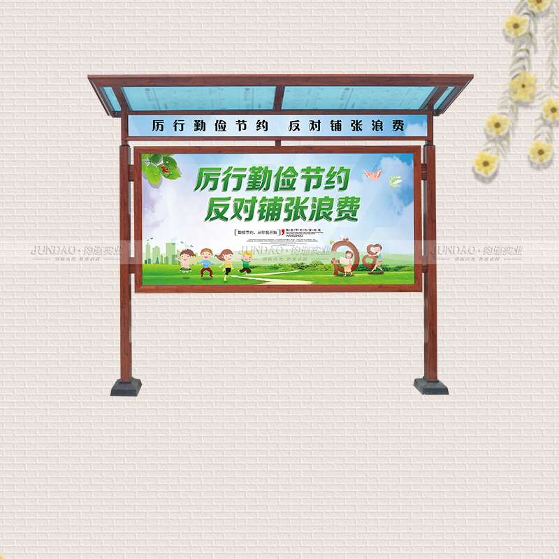 河南钧道实业有限公司主营:铝合金户外带雨棚宣传栏、垃圾分类亭、挂墙报栏、移动展架、广告铝框、可折叠海报架、灯杆道旗、带造型灯杆灯箱、党建标识牌、花草牌等成品。