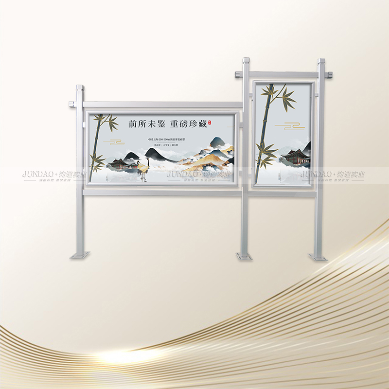 河南钧道实业有限公司主营:铝合金户外带雨棚宣传栏、垃圾分类亭、挂墙报栏、移动展架、广告铝框、可折叠海报架、灯杆道旗、带造型灯杆灯箱、标识牌、花草牌等成品。