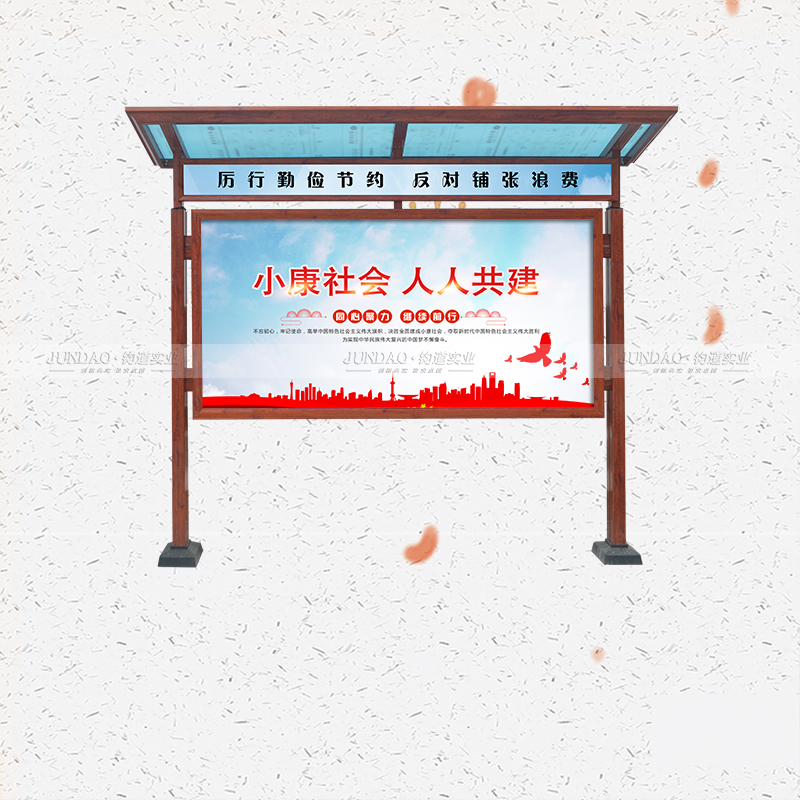 河南钧道实业有限公司主营:铝合金户外带雨棚宣传栏、垃圾分类亭、挂墙报栏、移动展架、广告铝框、可折叠海报架、灯杆道旗、带造型灯杆灯箱、标识牌、花草牌等成品。