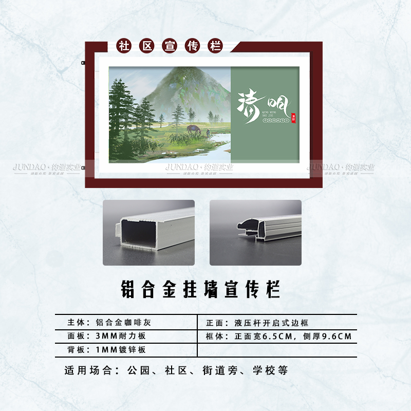 河南钧道实业有限公司主营;铝合金户外带雨棚宣传栏、垃圾分类亭,挂墙报栏、移动展架、开启式非开启式铝框、可折叠海报架、灯杆道旗、带造型灯杆灯箱、超薄灯箱、卡布拉布灯箱等成品。