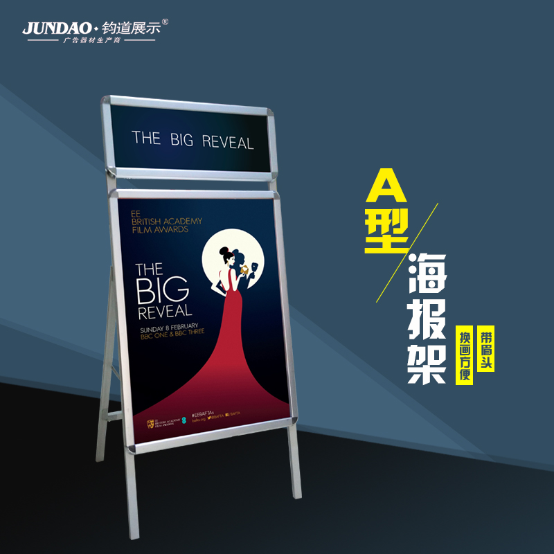 随着人们生活水平的日渐提升,人们的视觉感官等也在不断的提高要求,因此商家为了更好的吸引到消费者关注的目光也是煞费苦心,不断的创造新的宣传方式。为此,市场上广告宣传形式可谓是千变万化,更新频率超快,各种各样新式的广告器材都不断的涌向市场,冲击着人们的视觉神经,不断的点燃着人们的购买欲望。现在市面上畅销的海报架的边框一般都是用铝合金材质制成,因为铝合金比较牢固、便携。背板多用PVC材料,也有用KT板或者其他材料做的。画面就很随意了,因为可以随意更换,画面可以是纸质的、布料的,可以视情况而定。而且各个系列的海报架,不但美观大方,还拥有独特的外观,流畅的线条,适合用于地产界,房屋出租,品牌宣传、会议装饰、酒店大门口、超市特卖等场所。造型新颖,宣扬个性,安装极其简单,摆放自如,展示无限灵活。